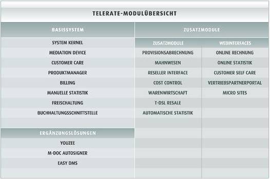 Integrale Bestandteile des TELERATE-Basissytems sind Module für Produktmanagement, Billing, Customer Relationship Management, Statistikauswertung und einiges mehr.