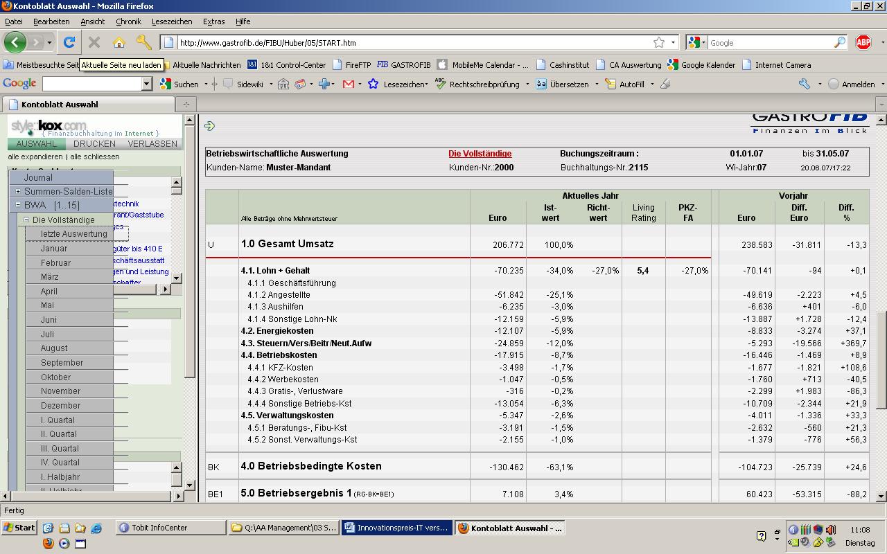 Finanzbuchhaltungssoftware mit kundenorientierter Darstellung und Einsicht in die betriebswirtschaftliche Auswertung über einen Online-Zugang (24h von jedem Ort verfügbar, zugeteilter Benutzername und geschütztes Passwort), Darstellung der Auswertungen aller Jahre, detailliert jedes einzelne Konto, Living-Rating Frühwarnsystem in jeder BWA (Schulnoten-Prinzip), nach Verbuchung ständige Aktualisierung der BWAs, Software ermöglicht individuelle Veränderungen
