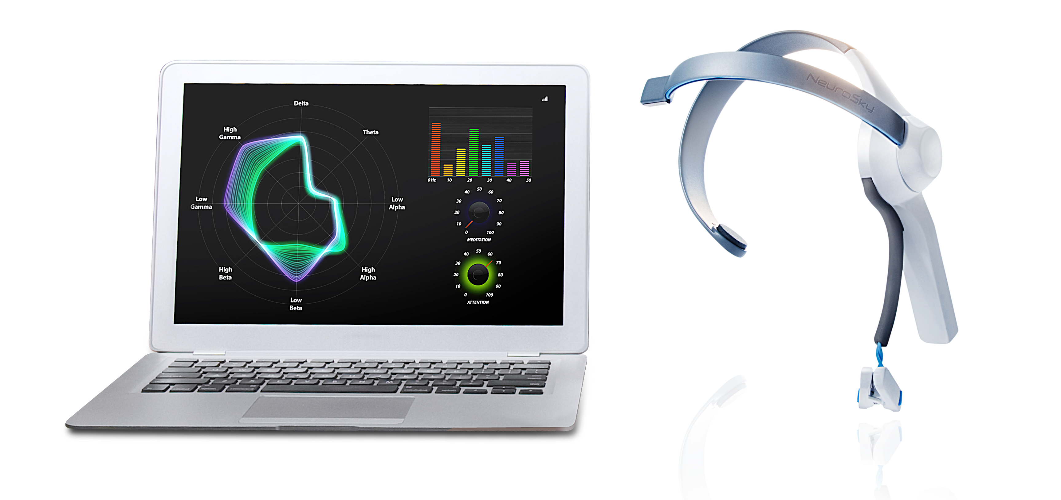 Das MindWave ist das weltweit erste Brain-Computer-Interface-Peripheriegerät, das für den Massenmarkt entwickelt wurde. Die Verbindung mit einem PC oder Mac erfolgt per drahtlosem USB-Plug-In. Zurzeit gibt es über 30 Spiele und Bildungsanwendungen, die in unserem AppStore zum Download zur Verfügung stehen. Das MindWave-Bundle beinhaltet 10 Anwendungen: SpeedMath, Meditation Journal, Think-Blink-Pop, Jumper, BlinkZone, MyndPlay und andere. Jede dieser Anwendungen integriert EEGs auf besondere Art und Weise. SpeedMath kontrolliert zum Beispiel die Aufmerksamkeit eines Schülers beim Lösen einfacher Rechenaufgaben. MyndPlay hingegen ist ein Videoprogramm, das in der Lage ist, anhand des Gemütszustands des Zuschauers Wendepunkte in der Handlung eines Filmes zu erkennen.