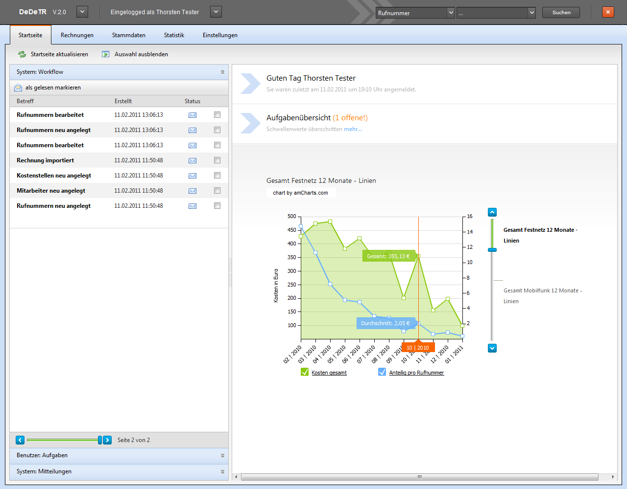 Die Bearbeitung und Verwaltung der Stamm- sowie der Rechnungsdaten wird zentral über die Oberfläche der Software gesteuert und kann darüber hinaus über Schnittstellen und spezielle Exporte extern erfolgen (z.B. mit Microsoft Excel). Dabei unterstützt DeDeTR über Systemhinweise den Benutzer bei seiner Arbeit (z.B. durch eine Warnung vor automatischer Verlängerung von Mobilfunkverträgen oder durch Hinweise auf die Schwellenwertüberschreitung einer Kostenstelle). Per Workflow können Aufgaben von einzelnen Mitarbeitern übernommen und deren Bearbeitung von allen Benutzern mit verfolgt werden. Zusätzlich können die Kostenstellenverantwortlichen nach dem Eingang der für sie relevanten Daten automatisch per E-Mail informiert und in den Workflow für die Rechnungsprüfung eingebunden werden.