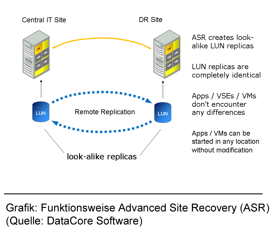 Die Advanced Site Recovery (ASR)-Software für die Mittelstandslösung SANmelody™ ist eine Lösung für die Ausfallsicherung, das Desaster Recovery zwischen mehreren Standorten und erhöht die Verfügbarkeit der Speicherumgebung in synchron gespiegelten Umgebungen, durch Eliminierung von Risiken bei HW Tausch und Upgrade. Darüber hinaus bietet ASR die Möglichkeit Applikations Testumgebungen bis in den konsolidierten Speicher zu ergänzen, mit dem Effekt, dass Tests auf aktuellen Daten jederzeit möglich sind. ASR nutzt lokale Speicherressourcen, um geplante und ungeplante Server-Ausfallzeiten einzelner Standorte zu minimieren, dadurch lassen sich Desaster Recovery-Anforderungen plattformübergreifend und besonders kosteneffektiv umsetzen.