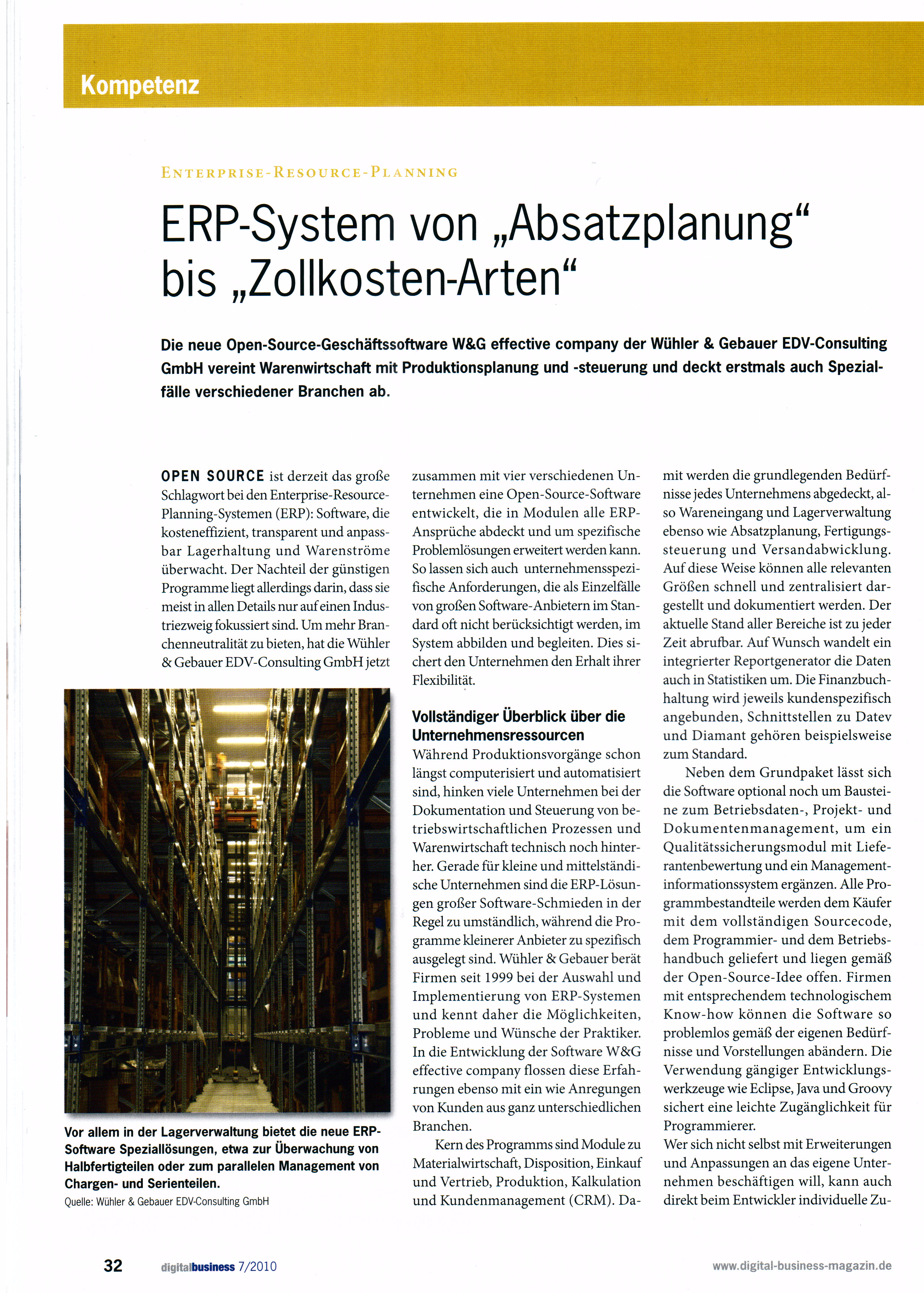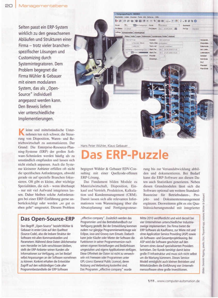 Unsere Kunden haben wir in den ersten Jahren bei der Auswahl, Einführung und Betreuung von ERP-Systemen unterstützt. Nach einigen Jahren haben wir uns dann entschlossen den Schritt zu wagen, unsere über fünfzehnjährige Erfahrung in ein eigenes, offenes, flexibles ERP-System einfließen zu lassen. Aus dieser Idee heraus haben wir dann die quellcodeoffene Softwarelösung W&G effective company® entwickelt. Nach vierjähriger Entwicklungsdauer konnte das System 2011 in Echtbetrieb gehen.