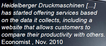 Mit Prinect Performance Benchmarking bietet Heidelberg Druckereien eine neue SaaS-Lösung, um die Produktivität der eingesetzten Speedmaster Druckmaschinen anonym mit den Leistungen von Maschinen in anderen Kundenbetrieben zu vergleichen. Dazu werden die Druckleistungen der angeschlossenen Maschinen automatisch von Heidelberg online erfasst, zentral ausgewertet und in einem Internetportal zur Auswertung bereit gestellt.