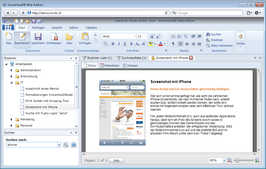 KnowHowDBweb ist eine Wissensmanagement-Lösung für das Erfassen von Wissen in einem Unternehmen. Mitarbeiter starten die Software ohne Installation in einem Web-Browser und können schnell Informationen finden und selbst eigenes Know-how erfassen. Dabei stehen ihm verschiedene Formatierungen, Einbinden von Grafiken und Tabellen, sowie das Verlinken von Einträgen zur Verfügung. Zudem können einem KnowHowDB-Dokument beliebige Dateien wie Word, Excel oder PDF angehängt, durchsucht und versioniert werden.