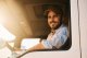 Ein lächelnder Lkw-Fahrer mit Kappe schaut aus dem Fahrerfenster seines Lasters.